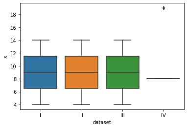 sns.boxplot(data=df,x="dataset",y="x") #다이아몬드 이상치