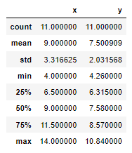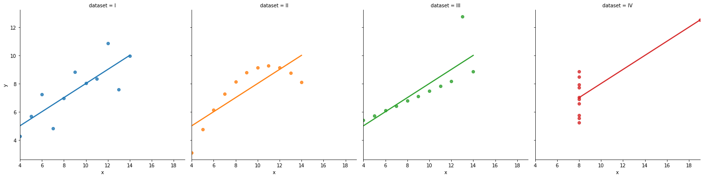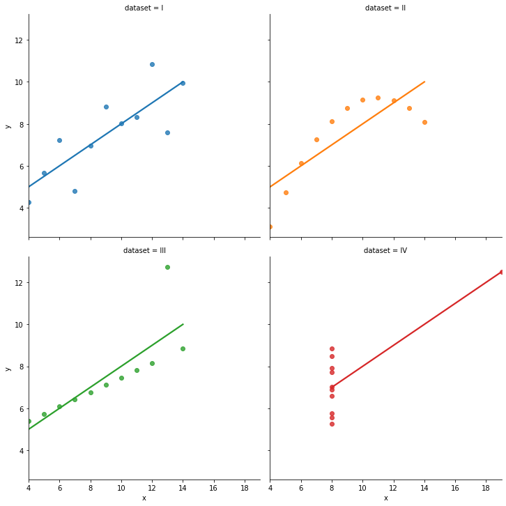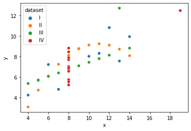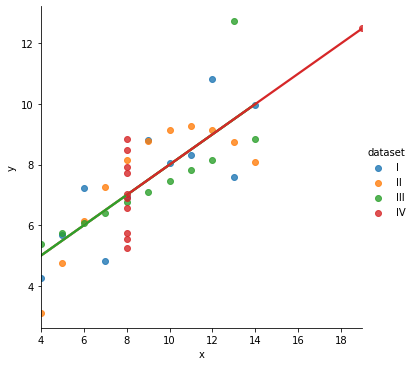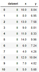 df=sns.load_dataset("anscombe") #씨본에서 제공하는 데이터, pd.read_csv("https://raw.githubusercontent.com/mwaskom/seaborn-data/master/anscombe.csv") 똑같음
