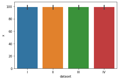 sns.barplot(data=df,x="dataset",y="x",ci="sd",estimator=np.sum) #ci는 신뢰수준, (기본값:평균 ,np.sum:합계)